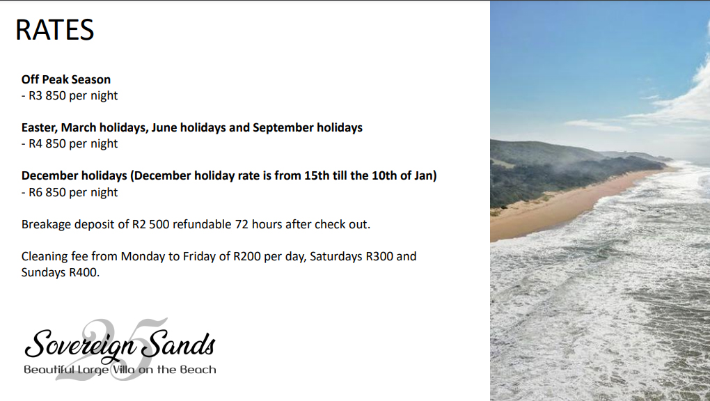 Sovereign Sands is situated some 20 kms from Salt Rock and 30 kms from the King Shaka Airport. It is a Unique Residential Estate set right on the beach. The Estate is secure with 24 hour security guarding and has direct access to the beach through controlled access gates. The beach is sublime offering miles of unspoiled shoreline and a perfect channel in which to swim.
